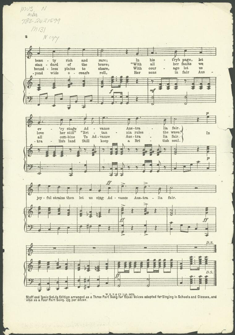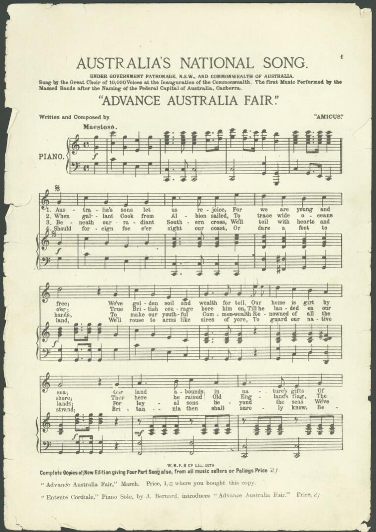 Mr. McCormick established a reputation with the patriotic song, “Advance Australia Fair”, which […] has come to be recognised as something in the nature of an Australian National Anthem.