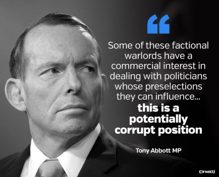“Some of these factional warlords have a commercial interest in dealing with politicians whose preselections they can influence,” Abbott said.