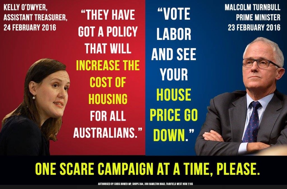Assistant Treasurer, Kelly O’Dwyer, clarified her statement. When she said that house prices would go up under Labor’s negative gearing plan, she wasn’t contradicting Malcolm “selfie” Turnbull’s assertion that they’d go down. Apparently, new houses will go up in price while old houses will go down.