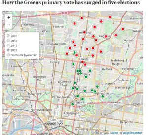 The Greens are waiting for inner city suburbs to gentrify to the point where working-class Labor voters no longer live there. It’s the demographics stupid. Let’s look at the Batman by election. A lot was written about the Bell Street divide, such as this New Daily article aptly titled ‘The hipster-proof fence’.