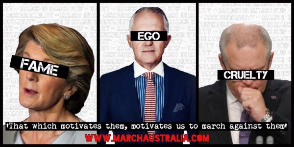 Three years on from the first March in March protests in 2014, the grassroots March Australia movement will host rallies on Saturday 25 March 2017 protesting the policies and decisions of the Turnbull Coalition government.